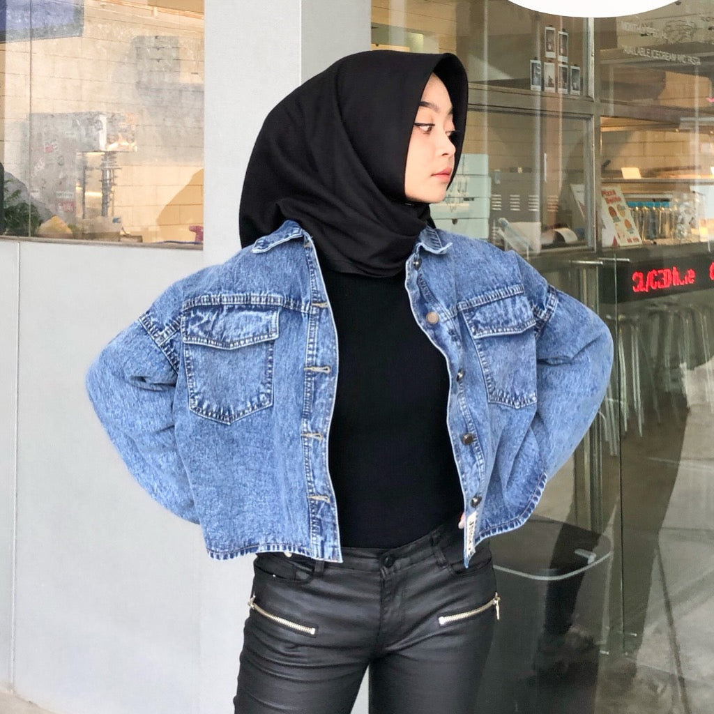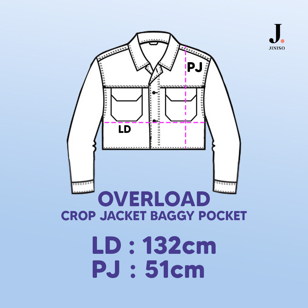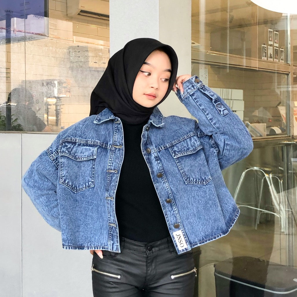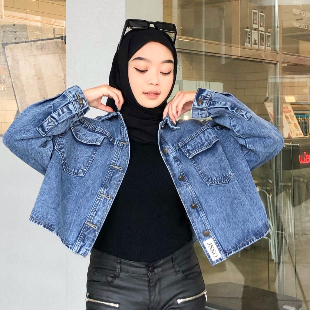 JINISO Jaket Crop Jeans Oversize Baggy Pocket Blue Acid